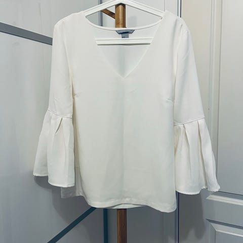 Hvid bluse i str. 40. Måler 104 cm over brystet. Sender gerne.