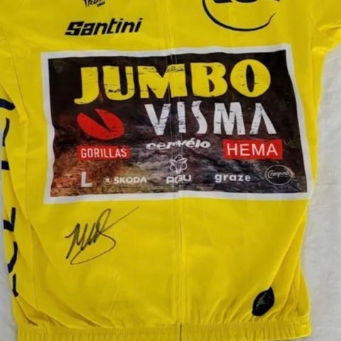 Signeret og original VM-trøje fra 2019. Den har altid hængt på bøjle i et skab, da det var meningen, at den skulle indrammes og op at hænge. Men jeg har ikke plads, så nu skal den videre og pryde et andet sted. Der kan evt. følge et par originale VM-bibs med i sort, som dog er brugt og kørt i af verdensmesteren selv mod en lille merpris. De originale mærker sidder i trøjen endnu.
