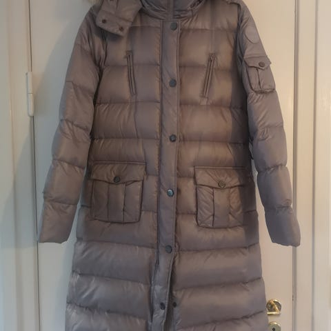 Str. 40, Frandsen frakke. Ægte dun og polyester, Næsten som ny, Flot støvet lilla frakke fra Frandsen. Blød, let og lækker med smukke vatteringer i slankende mønstre. Lynlås og trykknapper. Aftagelig hætte, lynlåslommer og lomme indvendig. Rynkeeffekt forneden og på ærmerne. Længde ca. 85 cm, overvidde ca. 2 x 55 cm, vidde forneden ca. 2 x 72 cm, ærmelængde ca. 65 cm. Farven snyder på foto. Frakken er meget flottere lys lilla. Sendes mod betaling af porto.