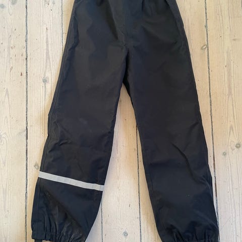 Lilla regnbukser med indstillelige seler i god stand. Str 128 cm/7-8 år. 0 røg, huller eller pletter. Sender gerne.