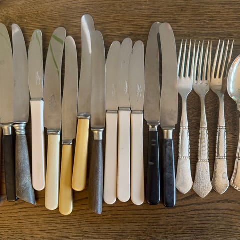 12 theskeer pr stk, 50, 4 pålægsgafler a kr 65