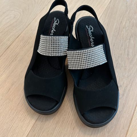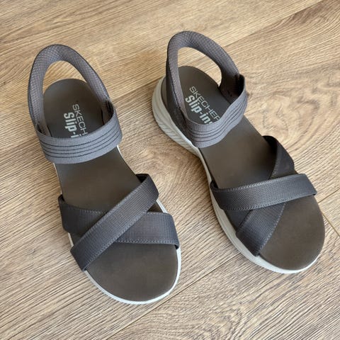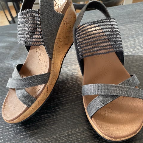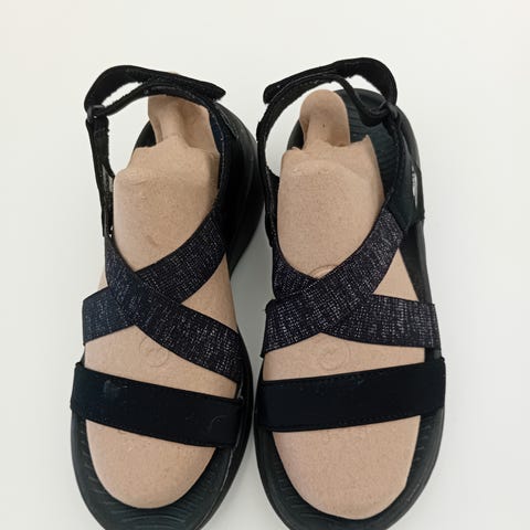 Overdel i blødt vævet strik for ekstra komfort. Elastisk rem så sandalen er super let at tage af og på.