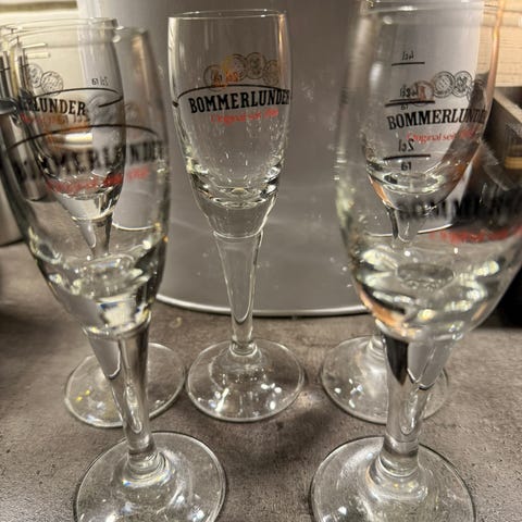 Glas, 6 bommerlunder snapseglas, plastspand og handske, 6 langstilkede bommerlunderglas - angivet til 2cl på bagsiden, men der kan vist snildt være det dobbelte.