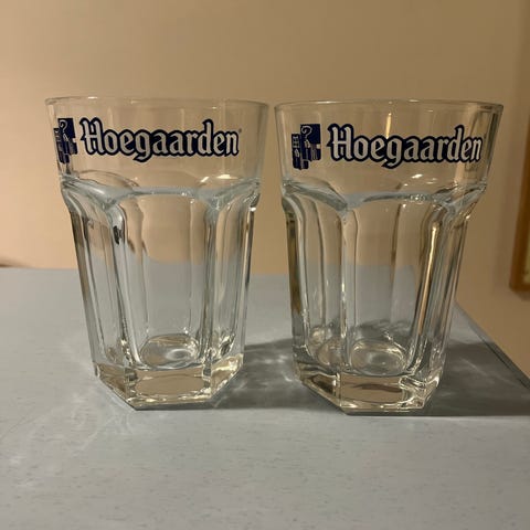 Pompøs Duo 2 stk. Stort gedigent-lækkert tungt sekskantet Hoegaarden Belgisk fadøl-glas. Også fint til is-kaffe, iste, kaffeglas, teglas, vandglas. Samlerobjekt (Sælger pt. hele min ølglas samling herinde;)