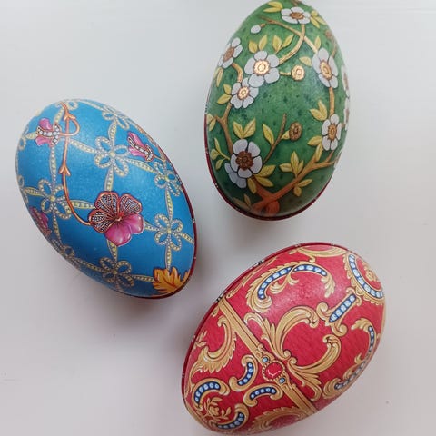 Porcelæns æg, kan åbnes, "Fabergé" lignende porcelæns æg dekoreret med blomster, små guldben og guldkant ved åbning..
