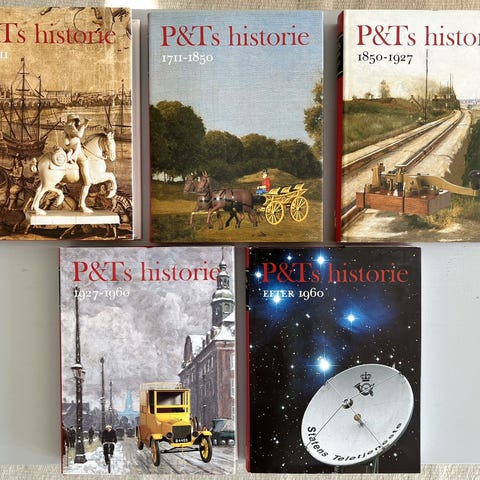Litteratur. P & T's Historie. Bind 1-5. Udgivet af Generaldirektoratet for Post & Telegrafvæsenet. 1. udgave 1991. Original rød helshirting med smudsomslag. Historisk pragtværk fra 1600-tallet
