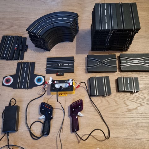 Racerbane i komplet stand, masser af tilbehør og 3 biler samt strømforsyning