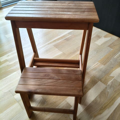 Der er brugsspor og et godt hak (se billeder) prisener sat derefter, men den er stadig stabil og klar til brug – eller kan nemt friskes op med lidt maling og evt træ polyfilla.
