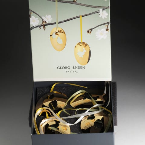 Æske med 2 Georg Jensen påskeskaller år 2005. Påskehare og påskekylling. Skallerne er udført i messing forgyldt med 24-karat guld. I god stand