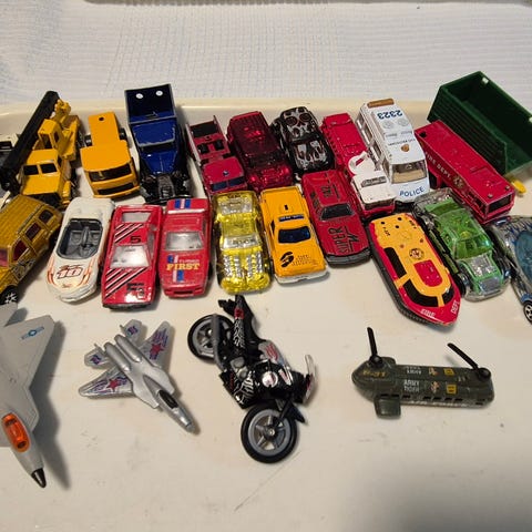 En masse legetøjs biler i forskellige størrelser, og et enkelt fly.