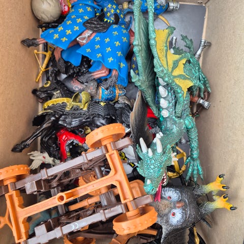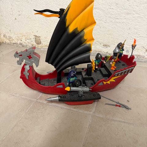En drage og et skib med kanoner der kan skyde. Og nogle riddere med vogn en skat med guld.