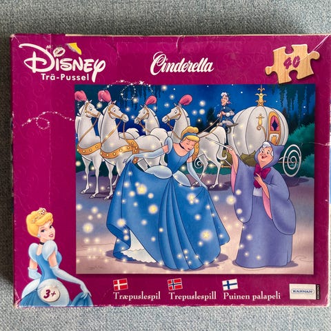 Puslespil med 48 brikker samt Askepot og prinsen som kan danse rundt på brikkerne som danner et dansegulv.