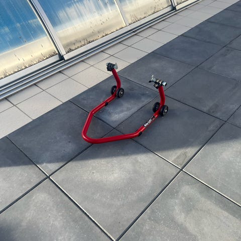 Et motocrossstativ, der monteres på bilens anhængertræk og kan justeres mellem 140 og 180 cm, så det passer til en række mindre cykler.