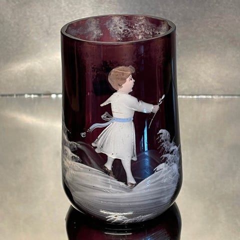 Glas, Vase, klart glas/blålig opaline/bølget guldkant, måge-motiv, <1984, 14 cm høj.