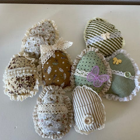 Unikt dekorativt trææg malet med akrylmaling og lakeret for en smuk, holdbar finish. Orkerede påskeæg er pyntet med hvid tråd ( tatting - teknik ), som giver det et elegant og romantisk udtryk.