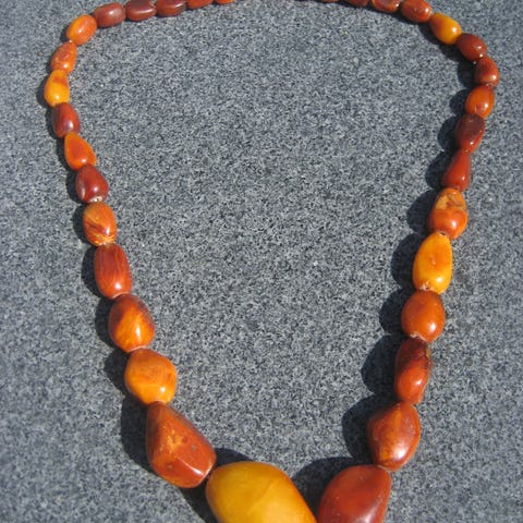 Meget flot rav hals kæde med glat slebne ravstykker i gradueret størrelse. Størst på midten/foran. Smuk dybde indtryk af de i alt 23 klare rav perler med masser at spil i. Dertil 2 små stykker rav som lås, der er sirligt forarbejdet, så de skrues sammen.