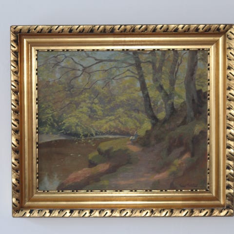 Maleri og ramme har en smule patina (se billeder), men fremstår overordnet rigtig pænt. Jeg gik i gang med at slibe rammen, men opgav i processen fordi det støvede ret meget og jeg bor i lejlighed (se billeder mod slutningen af annoncen) - dog var det ret nemt, så det kunne man fortsætte uden problemer, hvis man f.eks. gjorde det udenfor.