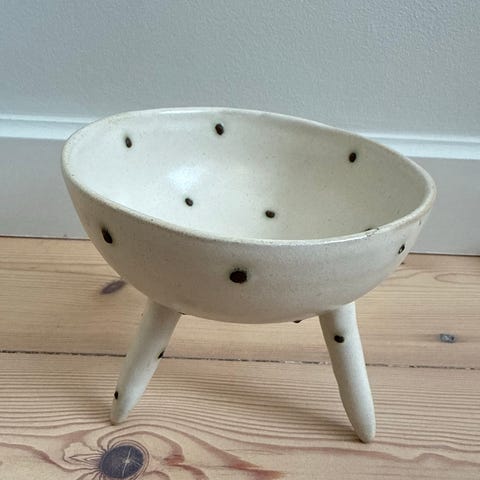 Fire små, glaserede keramikskåle - de tre blå med slangemotiv. Diameter ca. 7 cm. Alle signeret 'Lisa 05". Prisen er for hele sættet.