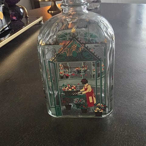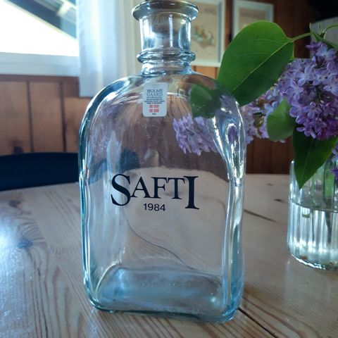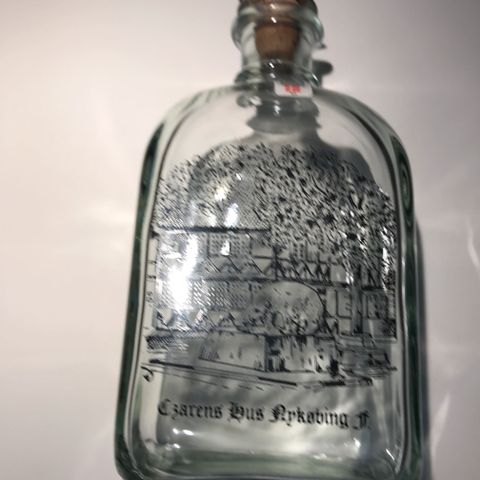Fine gamle snapseflasker fra Holmegaard med sølvprop og messingprop.