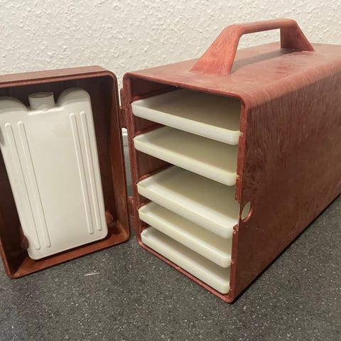 Inkl. køleelement og 5 udtagelige bakker. Velegnet til smørrebrød. Maden står sikkert, godt og køligt. Nypris 349 kr