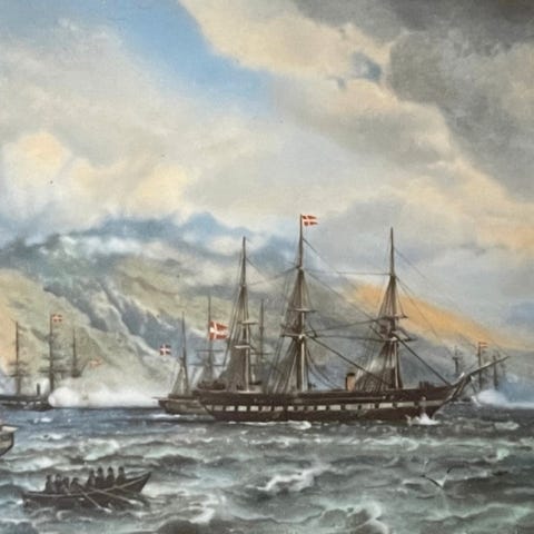 En smuk og velholdt platte fra Bing & Grøndahl. Platten viser det oprindelig skoleskib (1921 - 28), hvor det forsvandt. Platten er fra 1976.