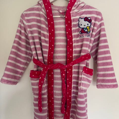 Hello Kitty morgenkåbe i pink. Lækker og blød. God at have med i svømmehal og på stranden. Diverse badetøj sælges også.