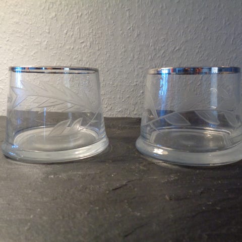 2 stk sæt Marie Sohl lysestager med sølvkant (lidt slidt) og graveret blomsterranker. Bund 7 cm, højde 7 cm og diameter 6 cm.