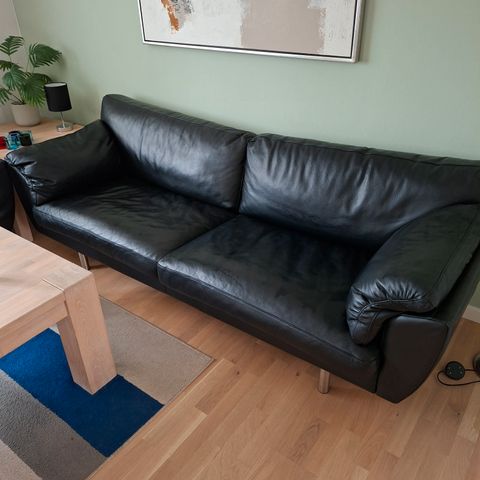Dejlig sofa, perfect til enten sommerhus eller træ inspireret design da stellet er a bøg, den har ingen skader eller revner i læder, men alderen kan anes når man kommer tæt på, den har stempel fra februar 2001