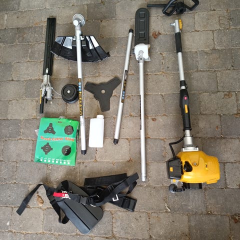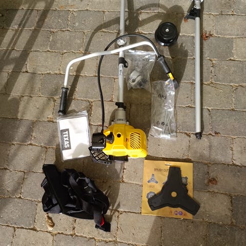 Texas busk-rydder Artnr: CG400B årg 2008, 1,80m lang, mont med 250mm 3 bladet klinge. (sælges som defekt) Da den ikke kan starte, Men gnist på tændrør,og kompression,når man trækker i startsnoren.