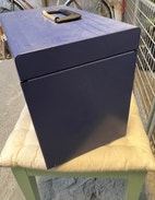 En del patina, noget rust på låg, metallet lidt skævt/åbnet bagpå (kan afhjælpes med en hammer). Fin indeni.