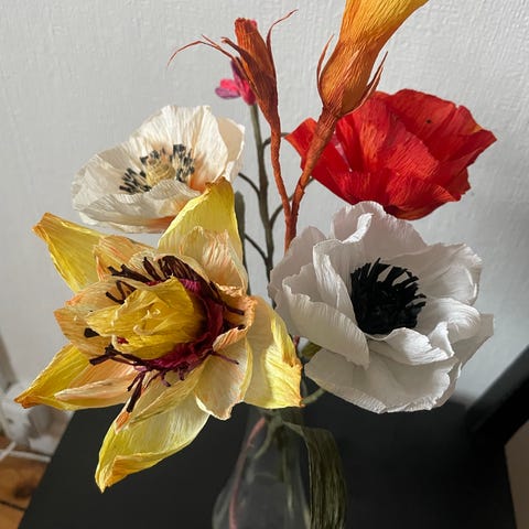 Små blå håndlavede forårsbebudere i crepe, der kan vikles om grene ell stå i en lille vase.