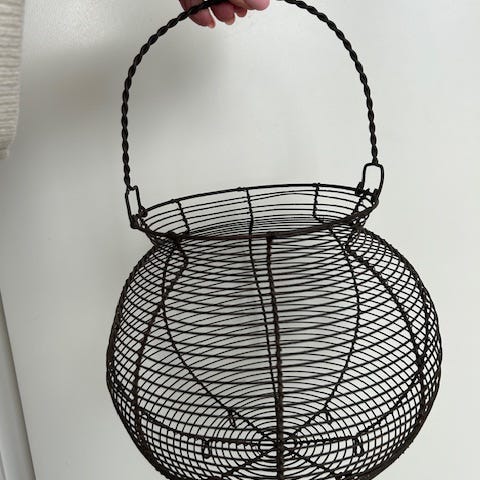 Sjælden, stor fransk æggekurv med fine hønsemotiver og flot autentisk patina. Kurven måler 20 cm i højden og har en diameter på 39 cm, hvilket gør den markant større end de fleste tilsvarende æggekurve.