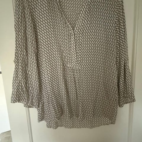Blusen måler 64'cm i længden foran og 68 cm bagpå. Over brystet måler den 2 x 45 cm. Den har 3/4 lange ærmer der kan kortes af med strop og knap. Dekoreret med små sommerfugle. Bomuld
