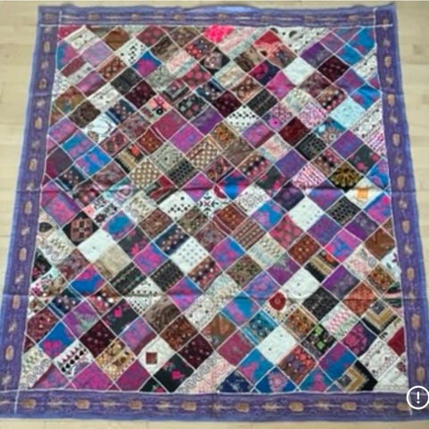 Håndlavet sengetæppe i patchwork. Lavet for mere end 30 år siden. Aldrig brugt. Mål: 215 cm x 129 cm. Sælges for kr. 500.