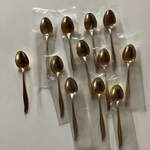 Bestik, Mokkaskeer, 6 stk. Guldfarvede mokkaskeer i æske med smukt udsmykkede skafter.