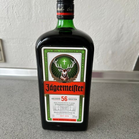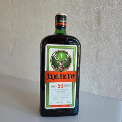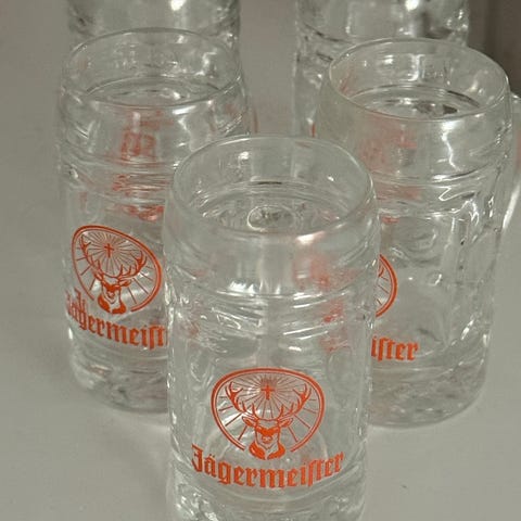 To fine blanke cylinder formede longdrink glas fra Jägermeister. Hver har en røre pind i elfenbensfarvet plastik med guld logo.