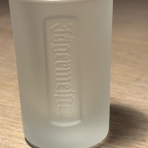 Glasset har hvid inskription og logo..... og på bagsiden opskrift på en 0,2 l drink,- vist med måle streger og tekst