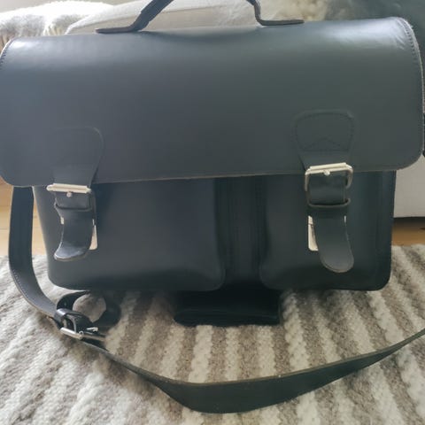 Unisex skuldertaske af kernelæder. Kvaliteten virker rigtig fin og snittet er meget som Ruitertassen, men den er mærket McNeill. Dog også lavet i Tyskland, men pris sat derefter.
