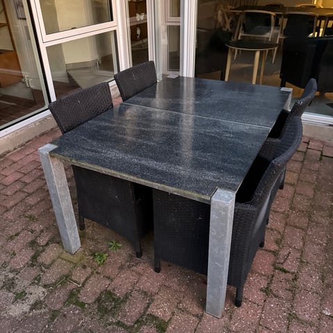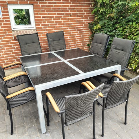 Vi sælger dette bund solide granitbord med 4 stole til. Stolene har vippe funktion. Bordet består af 3 granit plader der er nemme og tag af . Måler: