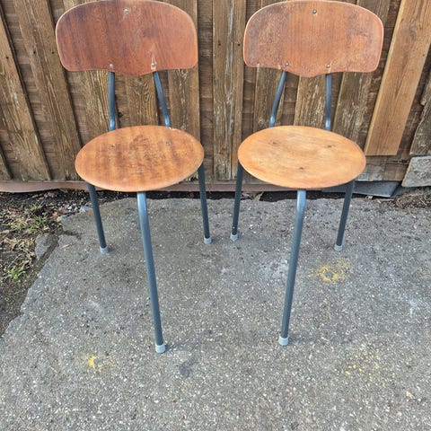 Gamle skolestole i teak finér. Varierende stel, og metoder til fastgørelse af skal til stel, nogle har synlige skruer i sæde. Ikke noget der river i tøjet.