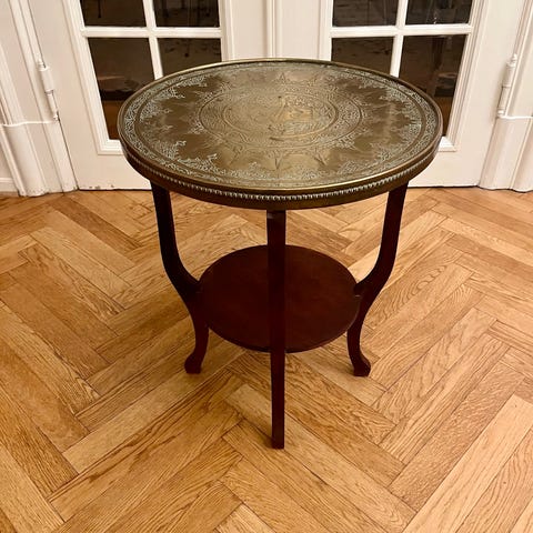 Rundt bord med hylde under og messig plade som sidder løst på. Messingpladen trænger til at blive pudset godt op.