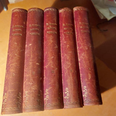 Privatbind: smukt indbundet i fem uniforme halvlæderbind med guldsnit og elegant sidepapir og forsatse - rødt gedeskind - smukt forgylderarbejde. Omslag ej medindbundet, ej signeret (svensk bogbinder, Hedberg?)