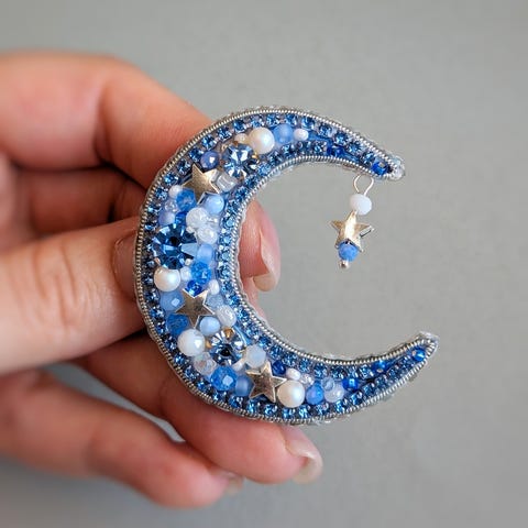 Materialer: Glasperler, krystaller, syntetiske perler, filt, læder på bagsiden, metalnål