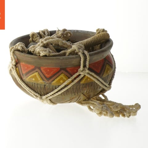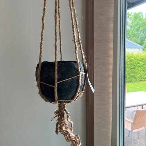 Dejlig hængepotte i flet med metalophæng. Kan anvendes uden- og indendørs. Foret med plastic der holder tæt.