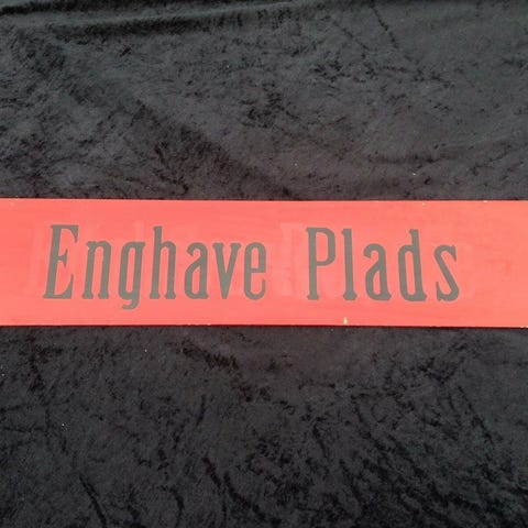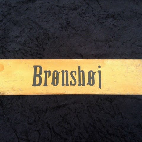 Skiltet er lavet af træ, og måler 60,5 x 12 cm