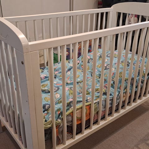 Stor hvid tremmeseng der også kan tages op som bedside.God stor hvid tremmeseng. Længden er 125 cirka breden er cirka 64 højden er cirka 88
