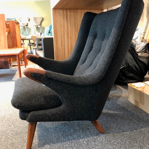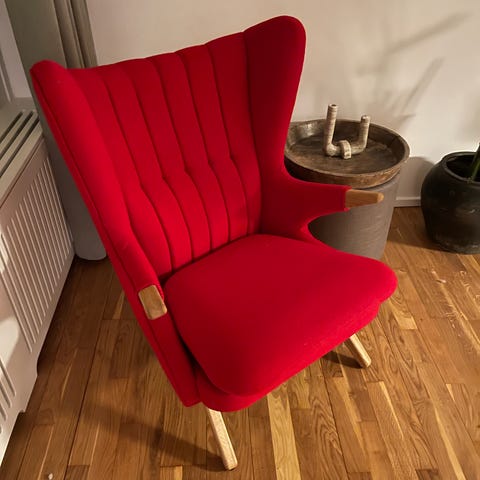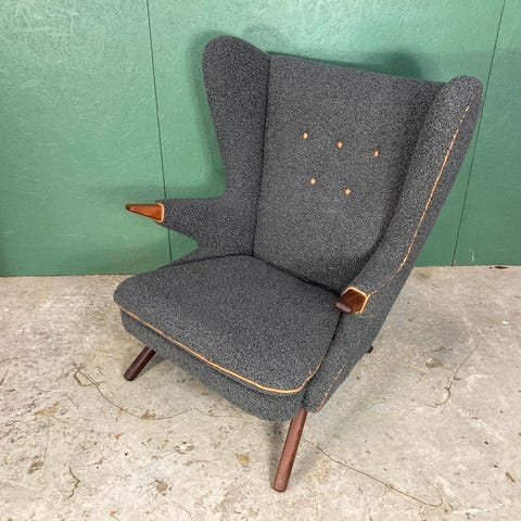 Smuk gammel Svend Skipper Bamsestol som bl.a. kendes på de skrå ben både for og bag på stolen. Den er om polstret i en smuk dyb lilla farve farve. Der finde få af disse. Jeg har tidligere solgt møbler og lavede et par stykker af disse. Den er om polstret hos professionel møbelpolstrer. Den er nu mit private eje og kan ses efter aftale da den står opbevaret på lager. Levering kan aftales mod betaling.