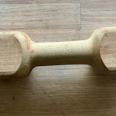 Mål 10 x 5 cm, hvor "bidestykket" er 4,5 cm, vægt ca 90 g