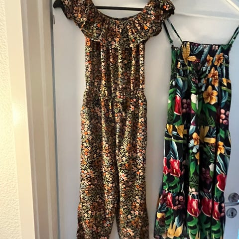 Heldragt med grå bundfarve, og blomster. Ingen ærmer. Med lommer.