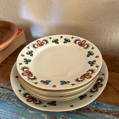 Porcelæn, Kaffekop kagetallerken sukkerskål flødekande skål, Porsgrund Norway, Gustavsberg porsgrund i Almue bonde mønster